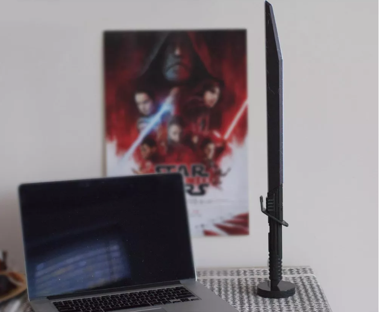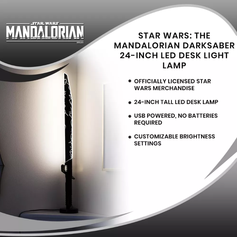 Standing almost 2 feet tall, this Star Wars Darksaber Table Lamp is modeled after the lightsaber we see in Moff Gideon's clutches in Star Wars: The Mandalorian! Using energy-efficient long-lasting LED light and USB-power, this lamp looks great plugged into your computer and displayed on your desk. For Star Wars completists or new fans, this new addition is the perfect gift.