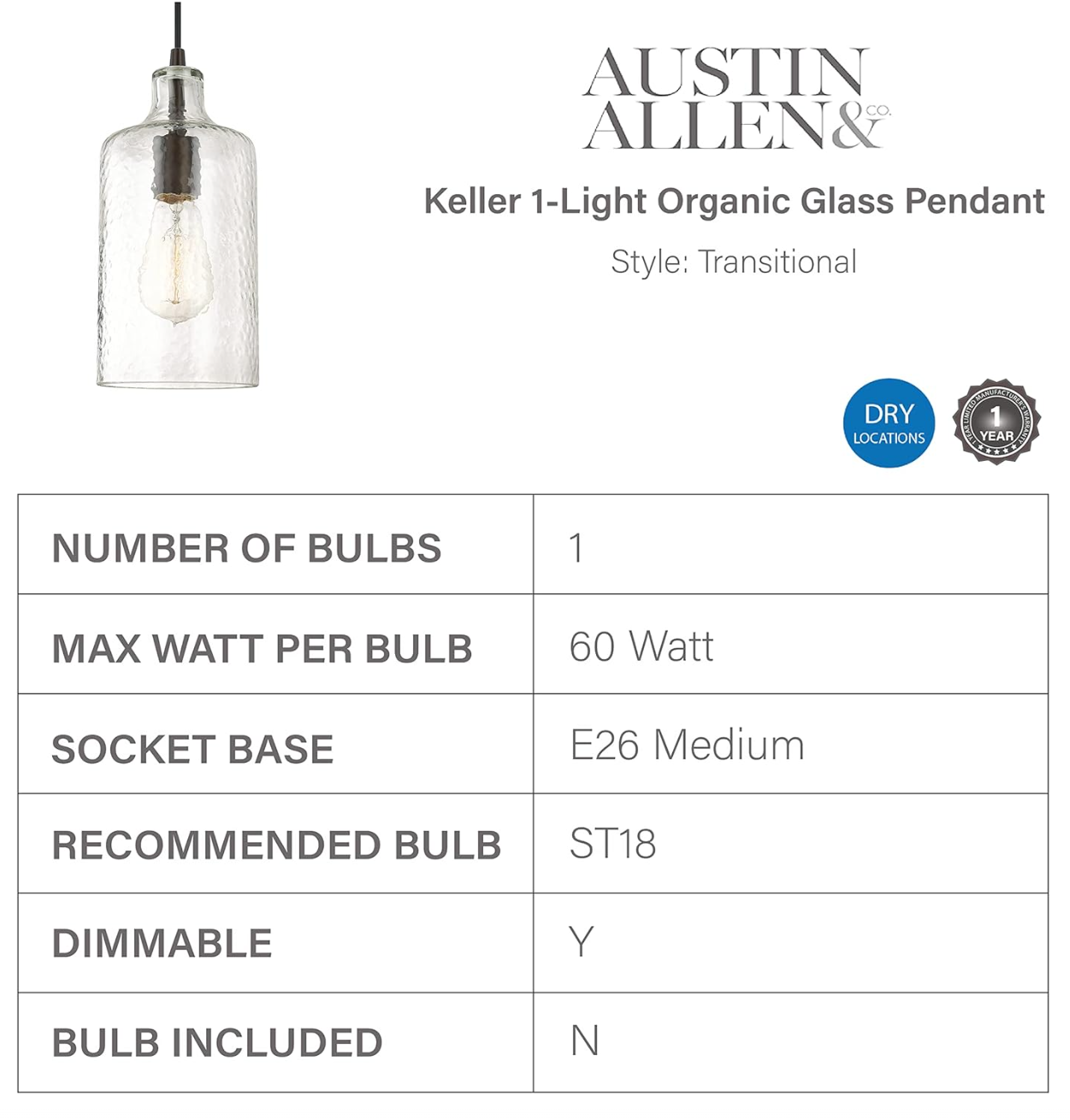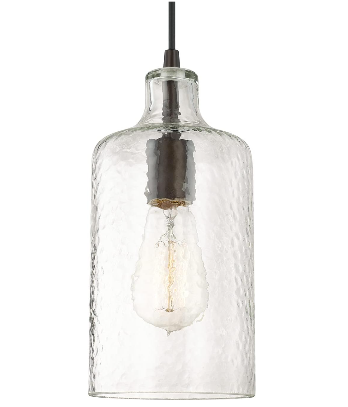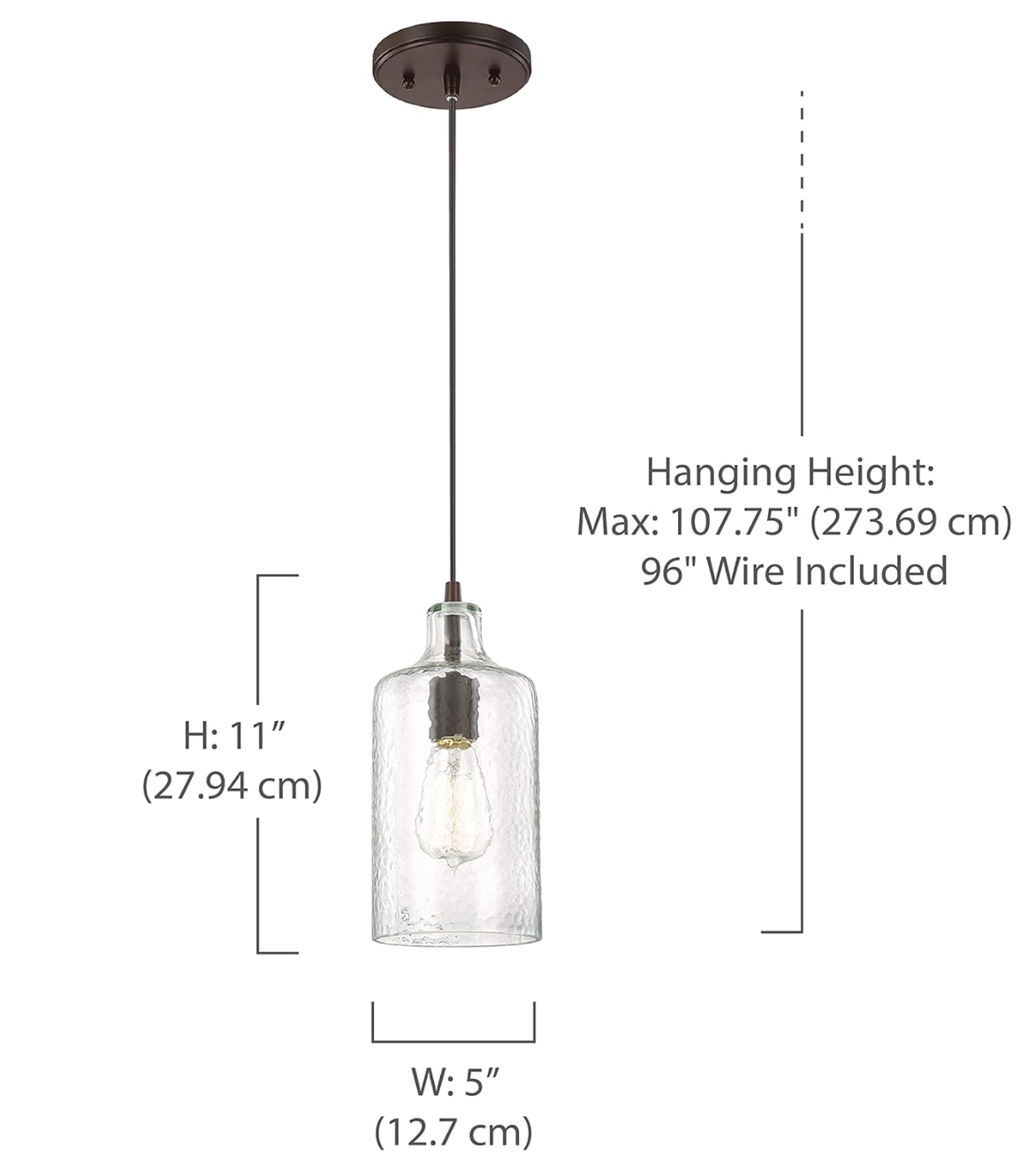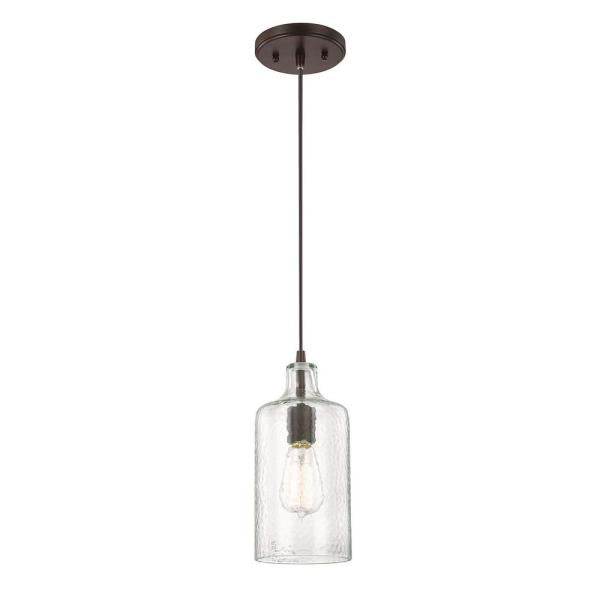 This 1-light pendant features a burnished bronze finish that will complement many urban, loft and transitional decors. The clear textured glass bulb cover adds interest to complete the look of this unique design. This piece includes 96 inches of wire so it can be hung at your desired height.