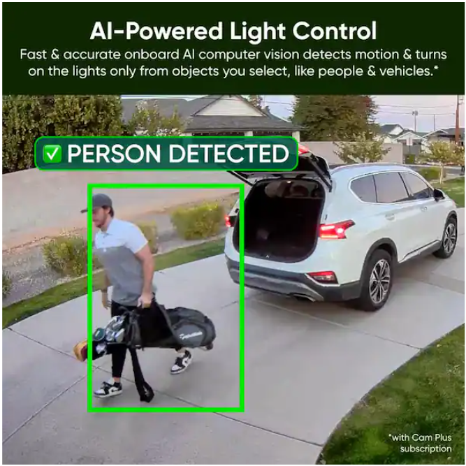 - AI-Powered Light Control + Motion-Activated Voice Deterrence**-Reduce false triggers! Edge-AI computer vision detects motion and turns on the lights only from objects you select, like people and vehicles. Plus, play a voice prompt to alert visitors they are being recorded. Wyze Cam Floodlight v2 requires a Cam Plus subscription to enable these features.